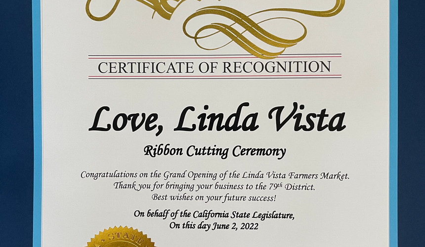 On Thursday June 2nd 2022 was our Grand Opening! Love, Linda Vista Farmers Market received a congressional award from Congresswoman Sara Jacobs for service to San Diego. The City of San Diego named June 2nd "Love, Linda Vista Farmers' Market Day". In addition, we also received an award from State Representative Dr. Akelah Weber's office!